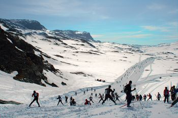 The start at Finse is at about 1220 MASL and the goal at Ustaoset is about 1000 m. Skarverennet is a cross-country skiing race held in Norway arranged by the club Geilo IL. Rennet går i slutten av april og markerer slutten på skisesongen for mange av deltagerne.